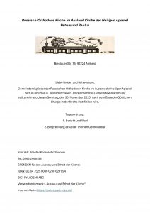 Spenden zur Unterstützung und Erweiterung der Kirche ist sehr wichtig, weil unsere Kirche existiert auf Basis freiwilliger Spenden. Der Gemeinderat der Kirche ist für jede Hilfe und Unterstützung bei der Entwicklung des Gemeindelebens unserer Kirche dankbar.